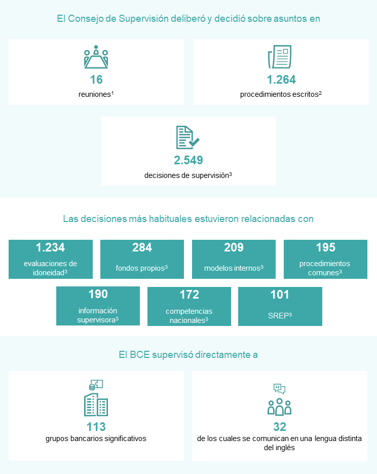 Estas decisiones se refieren a decisiones concluidas o adoptadas en el período de referencia (es decir, decisiones emitidas). En el número total se incluyen 42 procedimientos aprobados por el Consejo de Supervisión mediante el procedimiento por el que «toma nota» sin emitir una decisión de supervisión. El número de decisiones de supervisión no se corresponde con el número de procedimientos de autorización que fueron notificados oficialmente al BCE en el período de referencia (es decir, procedimientos de notificación recibidos). Una decisión puede contener varias aprobaciones del supervisor.