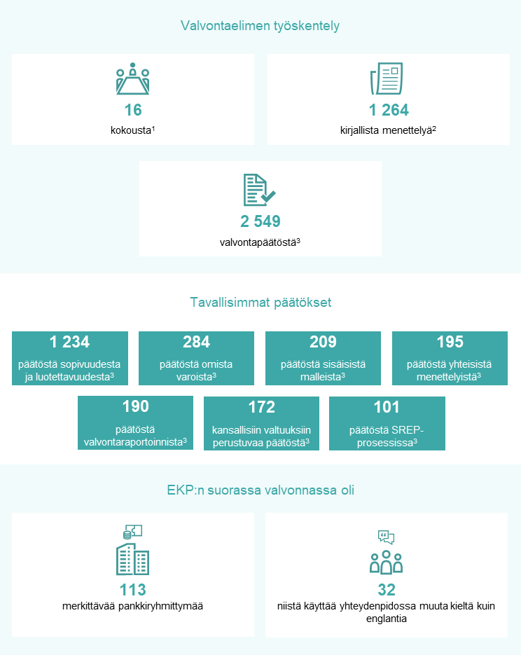 Päätökset, jotka loppuunsaatettiin tai hyväksyttiin raportointijakson aikana. Määrään sisältyy 42 menettelyä, jotka valvontaelin hyväksyi kommentoimalla (kirjallisella menettelyllä) antamatta valvontapäätöstä. Valvontapäätösten määrä ei ole sama kuin EKP:lle raportointijakson aikana virallisesti ilmoitettujen lupahakemusten määrä. Yhteen päätökseen saattaa sisältyä monta hyväksyntää.