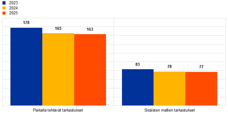 Vuonna 2025 paikalla tehtävissä tarkastuksissa (ks. osa 1.4.2) keskityttiin vähittäis- ja liikekiinteistöluottoihin, korkean velkarahoitusasteen luottoihin sekä suuryritysten tai pk-yritysten luottoihin. Erityishuomion kohteena olivat luoton myöntämisprosessit, riskien luokittelu ja odotettavissa olevien luottotappioiden mallintamiskäytännöt.