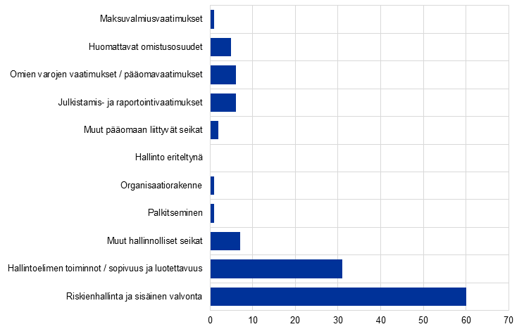 Pankkien kyky hallita asianmukaisesti ilmasto- ja ympäristöriskejä[14] oli tärkeä valvontakohde vuonna 2025, sillä fyysisiä ja siirtymäriskejä esiintyi edelleen entistä suurempina ja entistä useammin, eivätkä pankit ole vielä korjanneet niihin liittyviä riskinhallintajärjestelmiensä puutteita.