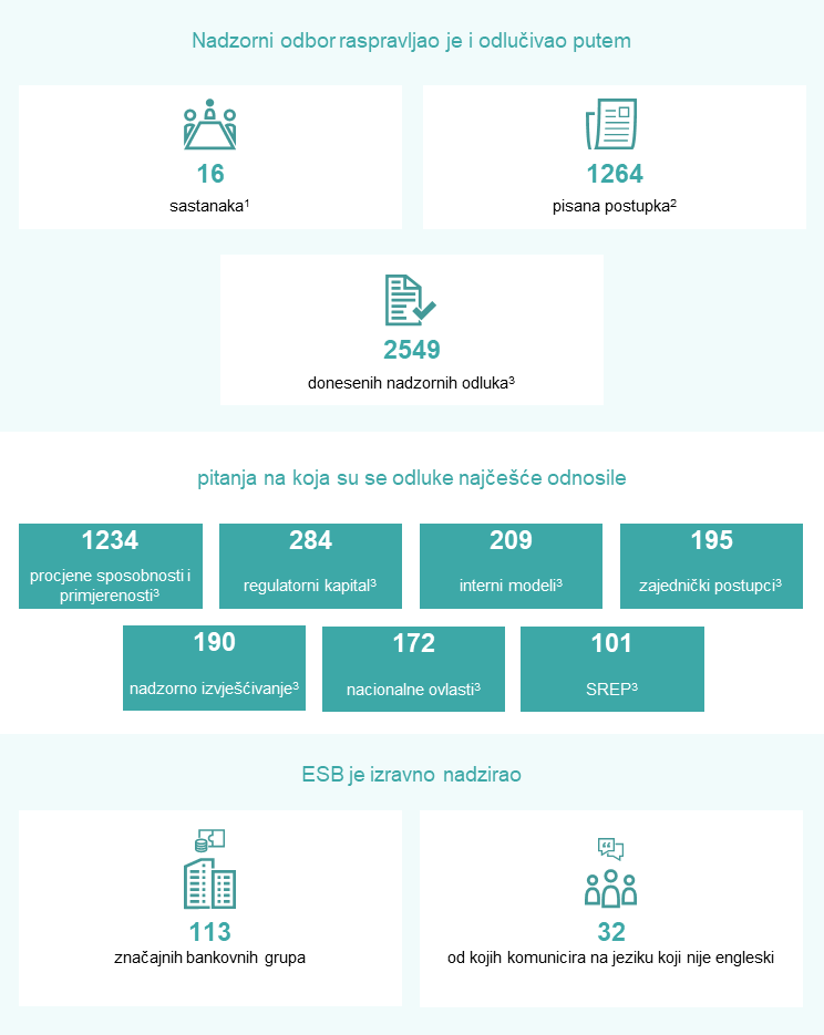 To su odluke koje su dovršene ili donesene u izvještajnom razdoblju (tj. izlazne odluke). Ukupan broj uključuje 42 postupka koje je Nadzorni odbor odobrio u sklopu postupka „primanja na znanje” bez izdavanja nadzorne odluke. Broj nadzornih odluka ne odgovara broju postupaka odobrenja koji su službeno upućeni ESB‑u u izvještajnom razdoblju (tj. zaprimljeni upućeni postupci). Jedna odluka može sadržavati nekoliko nadzornih odobrenja.