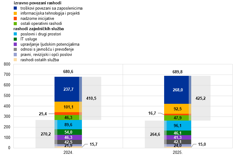 Troškovi povezani s horizontalnim zadaćama i specijaliziranim uslugama raspoređuju se razmjerno na osnovi punog troška za izravni nadzor značajnih institucija odnosno troškova nadgledanja nadzora manje značajnih institucija. Za svaku skupinu prikazani troškovi obuhvaćaju dio usluga zajedničkih služba koje pružaju poslovna područja ESB‑a za potporu.