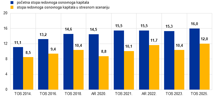 Ukupno gledano, u testiranju otpornosti na stres naglašena je otpornost bankarskog sektora europodručja u nadvladavanju ozbiljnog, ali mogućeg pada gospodarske aktivnosti. U testiranju otpornosti na stres u 2025. ponovo je potvrđena sve veća otpornost bankarskog sektora od uspostave jedinstvenoga nadzornog mehanizma (SSM) u 2014. Ukupna stopa redovnoga osnovnoga kapitala povećala se za 4,9 postotnih bodova i iznosila je 16,0 % na kraju 2024. u odnosu na 11,1 %, koliko je iznosila krajem 2013. (Grafikon 1.). Stopa redovnoga osnovnoga kapitala u nepovoljnom stresnom scenariju postupno se povećavala u tom razdoblju i bila je za 3,5 postotnih bodova veća u testiranju u 2025. od razine zabilježene u sveobuhvatnoj procjeni ESB‑a iz 2014. U odnosu na testiranje provedeno u 2023. rezultati testiranja otpornosti na stres u 2025. pokazali su veće ukupne gubitke za kreditni rizik, s obzirom na zamjetan porast neprihodonosnih kredita, a gubitci zbog tržišnog rizika, gubitci zbog operativnog rizika i utjecaj na iznos izloženosti riziku bili su uglavnom isti kao u prethodnom testiranju u 2023.