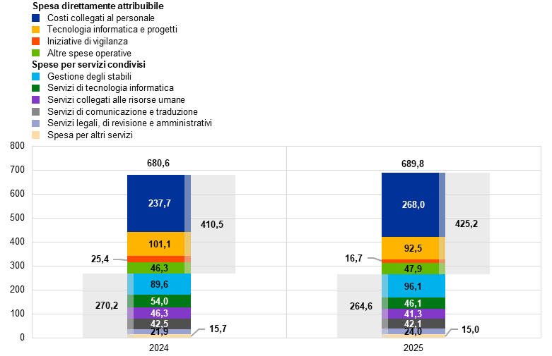 I costi associati ai compiti trasversali e ai servizi specialistici sono ripartiti in misura proporzionale sulla base, rispettivamente, del costo pieno per la vigilanza diretta sugli enti significativi e di quello per la supervisione della vigilanza sugli enti meno significativi. Per ciascun gruppo, le spese riportate includono la ripartizione dei servizi condivisi forniti dalle aree operative di supporto della BCE.