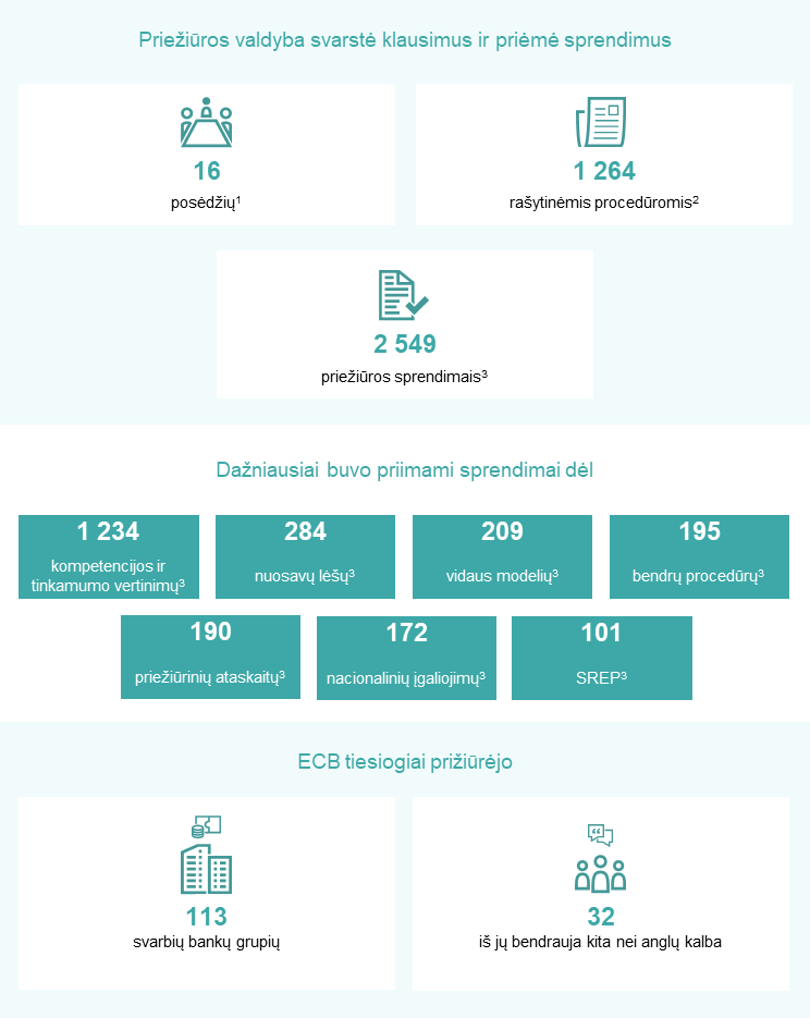 Tai – per ataskaitinį laikotarpį galutinai užbaigti arba priimti sprendimai, t. y. paskelbti sprendimai. Į bendrą sprendimų skaičių įtrauktos 42 procedūros, kurias Priežiūros valdyba patvirtino taikydama susipažinimo su informacija procedūrą, nepriimdama priežiūros sprendimo. Priežiūros sprendimų skaičius neatitinka leidimų suteikimo procedūrų, apie kurias per ataskaitinį laikotarpį buvo oficialiai pranešta ECB, t. y. gaunamų pranešimų apie procedūras, skaičiaus. Vienas sprendimas gali apimti kelis priežiūros institucijų patvirtinimus.
