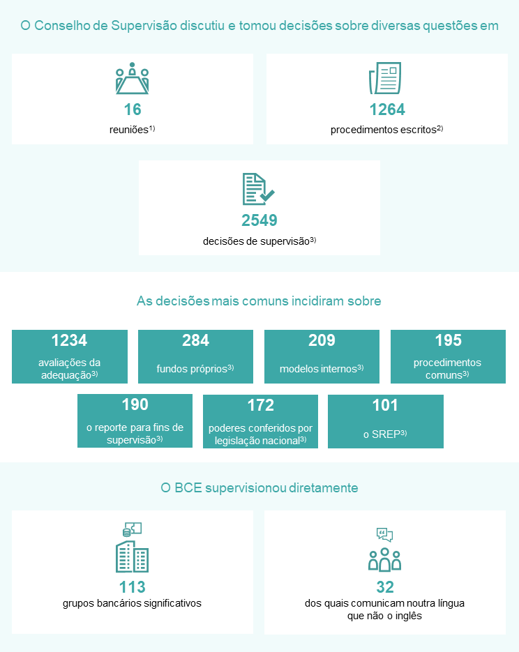 Refere‑se a decisões finalizadas ou adotadas no período em análise. O total inclui 42 procedimentos aprovados pelo Conselho de Supervisão através do procedimento de “tomar nota”, sem emitir uma decisão de supervisão. O número de decisões de supervisão não corresponde ao número de procedimentos de autorização oficialmente notificados ao BCE no período em análise (ou seja, os procedimentos de notificação que deram entrada no BCE). Uma decisão pode conter várias aprovações pelas autoridades de supervisão.