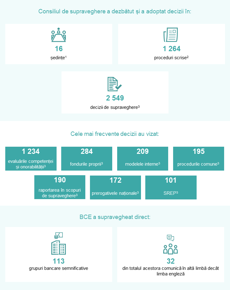 Aceste decizii se referă la decizii finalizate sau adoptate în perioada de raportare (mai exact, decizii transmise). Numărul total include 42 de proceduri pe care Consiliul de supraveghere le-a aprobat prin procedura de „luare la cunoștință” fără a emite o decizie în materie de supraveghere. Numărul de decizii de supraveghere nu corespunde numărului de proceduri de autorizare care au fost notificate BCE în mod oficial în perioada de raportare (mai exact, proceduri de notificare primite). O decizie poate conține mai multe aprobări de supraveghere.