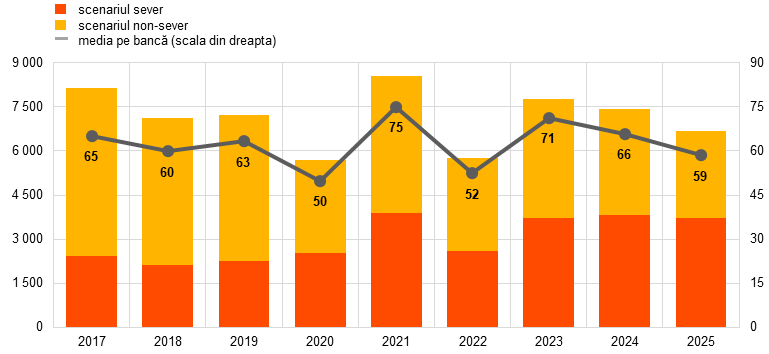 În ansamblu, testarea la stres a evidențiat reziliența sectorului bancar din zona euro în contracararea unui declin economic sever, dar plauzibil. Testarea la stres din 2025 a reafirmat reziliența tot mai mare a sectorului bancar de la instituirea Mecanismului unic de supraveghere (MUS) în 2014. Pornind de la un nivel de 11,1% la sfârșitul anului 2013, rata agregată a fondurilor proprii de nivel 1 de bază a crescut cu 4,9 puncte procentuale, ajungând la 16,0% la sfârșitul anului 2024 (Graficul 1). În scenariul nefavorabil al testării la stres, rata fondurilor proprii de nivel 1 de bază s-a majorat treptat, în prezența unor tensiuni, în perioada analizată, ajungând la un nivel cu 3,5 puncte procentuale mai ridicat în exercițiul din 2025 decât cel observat în evaluarea cuprinzătoare realizată de BCE în 2014. Comparativ cu exercițiul din 2023, rezultatele testării la stres din 2025 au indicat pierderi globale mai mari pentru riscul de credit, având în vedere o majorare superioară a creditelor neperformante, în timp ce pierderile din riscul de piață, pierderile din riscul operațional și impactul asupra valorii expunerii la risc au fost, în linii mari, similare exercițiului anterior din 2023.