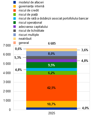 În 2025, BCE a finalizat un program multianual de promovare a capacităților băncilor de gestionare a riscurilor și a continuat tranziția către o abordare de tip statu-quo prin supravegherea riscurilor legate de schimbările climatice și de natură ca parte a evaluărilor și proceselor sale periodice de supraveghere. Pe baza cerințelor de reglementare actuale, BCE a stabilit sfârșitul anului 2024 ca termen preconizat pentru ca băncile să își îmbunătățească practicile aferente de gestionare a riscurilor. În anii precedenți și în urma diverselor runde de dialog și feedback, BCE a emis decizii de supraveghere cu caracter obligatoriu pentru băncile cu deficiențe semnificative, combinate cu penalități cu titlu cominatoriu care s-au acumulat zilnic în cazul în care băncile nu au îndeplinit aceste cerințe privind riscurile în termenele stabilite („decizii combinate”)[15]. În 2025, BCE a emis o astfel de decizie combinată în legătură cu aceste cerințe. De asemenea, a finalizat o procedură de executare referitoare la nerespectarea de către o entitate a unei decizii a BCE referitoare la aceste cerințe privind riscurile, în care a stabilit valoarea totală a penalităților cu titlu cominatoriu (Secțiunea 2.3.1).