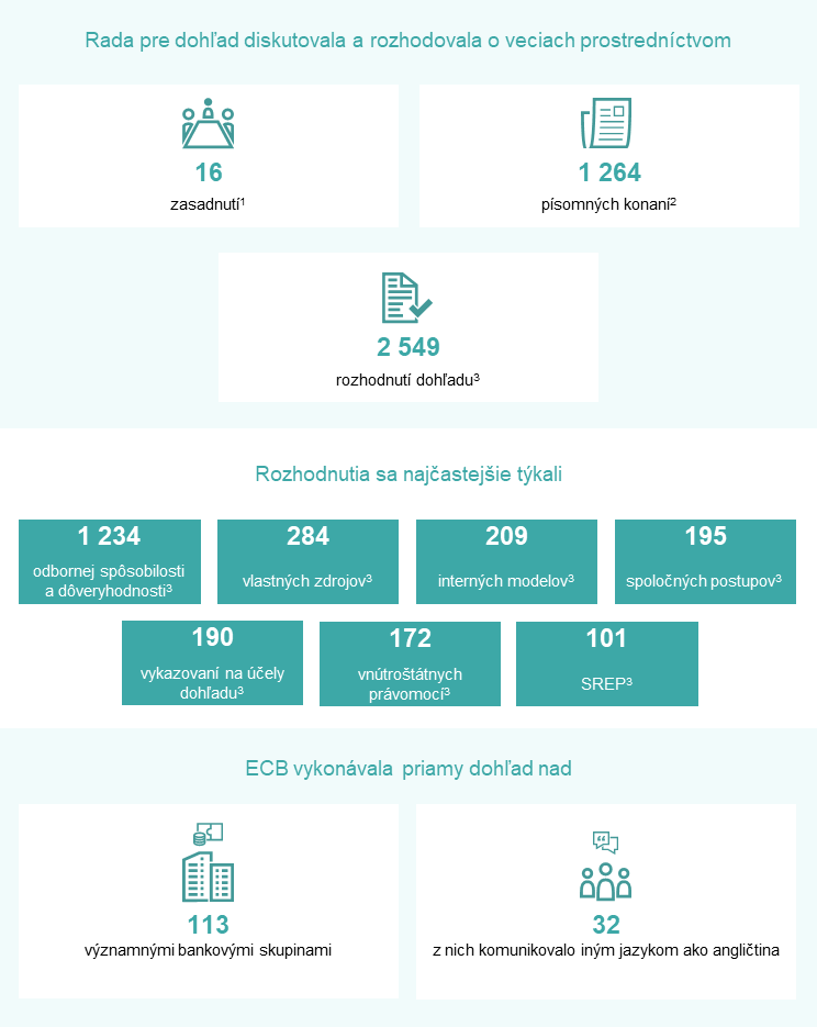 Ide o rozhodnutia, ktoré boli uzavreté alebo prijaté vo vykazovacom období (t. j. vydané rozhodnutia). Ich celkový počet zahŕňa 42 konaní, ktoré Rada pre dohľad schválila postupom „vzatia na vedomie“ bez vydania rozhodnutia dohľadu. Počet rozhodnutí dohľadu nekorešponduje s počtom povoľovacích konaní, o ktorých bola ECB oficiálne notifikovaná v danom vykazovacom období (t. j. prijaté notifikačné konania). Jedno rozhodnutie môže obsahovať niekoľko súhlasov dohľadu.
