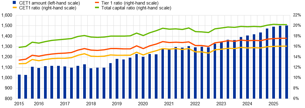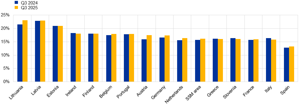 Capital ratios interactive reportIn the third quarter of 2025, the aggregate Common Equity Tier 1 (CET1) ratio and the Tier 1 ratio of significant institutions (banks supervised directly by the ECB) were slightly lower than in the previous quarter. The aggregate CET1 ratio stood at 16.10% and the aggregate Tier 1 ratio stood at 17.59%. At the same time, the aggregate total capital ratio remained stable at 20.24% compared to the previous quarter. Across countries, the CET1 ratio ranged from 13.28% in Spain to 23.12% in Lithuania in the third quarter of 2025.