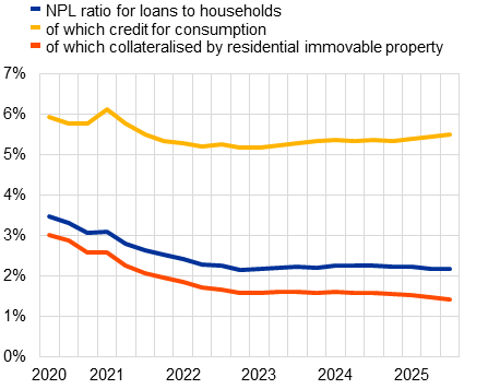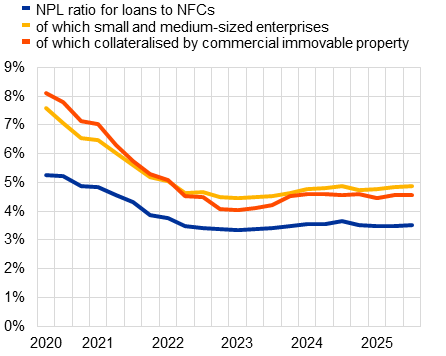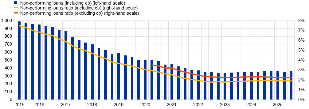 Non-performing loans interactive reportThe non-performing loans (NPL) ratio excluding cash balances at central banks and other demand deposits stood at 2.22% in the third quarter of 2025. The stock of NPLs (numerator) increased by €1.49 billion (0.42%), and at the same time the total amount of loans and advances (denominator) rose by €30.95 billion (0.19%). As a result, the ratio remained stable compared to the previous quarter.