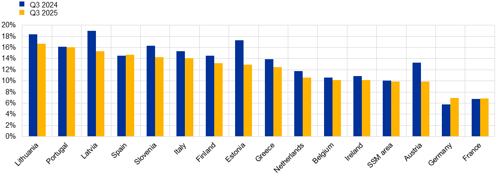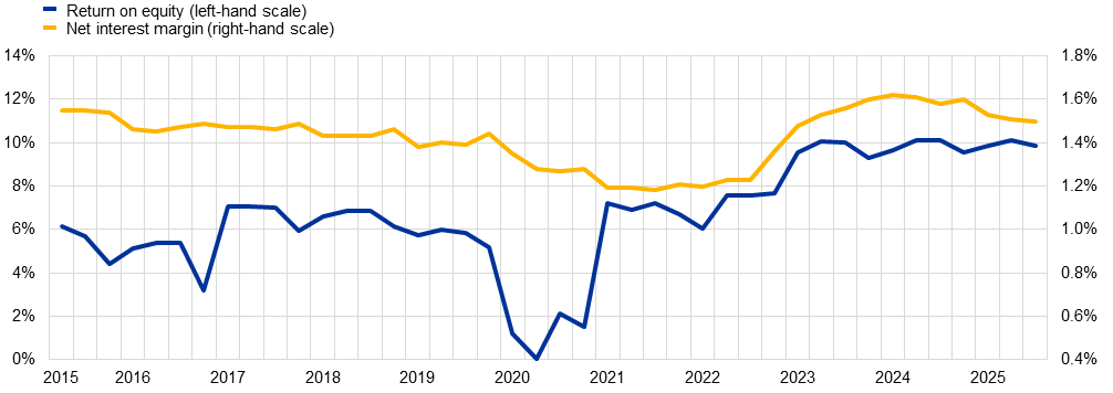 Profitability interactive reportThe aggregate annualised return on equity stood at 9.88% in the third quarter of 2025 compared with 10.11% in the previous quarter and 10.09% one year ago. The return on equity across countries ranged from 6.82% in France to 16.66% in Lithuania in the third quarter of 2025. At the same time, the aggregate net interest margin was basically unchanged compared to the previous quarter.