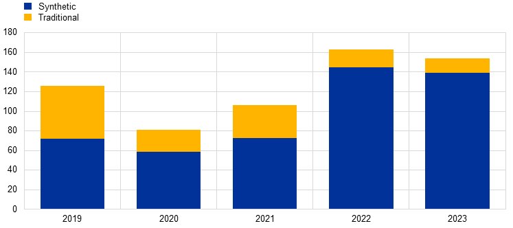 Focusing on SRT transactions and based on provisional data, the volume of instruments backed by performing loans and originated by banks under direct ECB supervision declined slightly in 2023 to around €154 billion (from €163 billion in 2022). Synthetic transactions continued to account for the largest share of transactions in the performing loans segment (90.5%), showing that banks execute SRT transactions to optimise their capital situation. Cash transactions were on a declining path, from 45% in 2019 to less than 10% in 2023. Corporate loans continued to be the largest class of securitised assets.