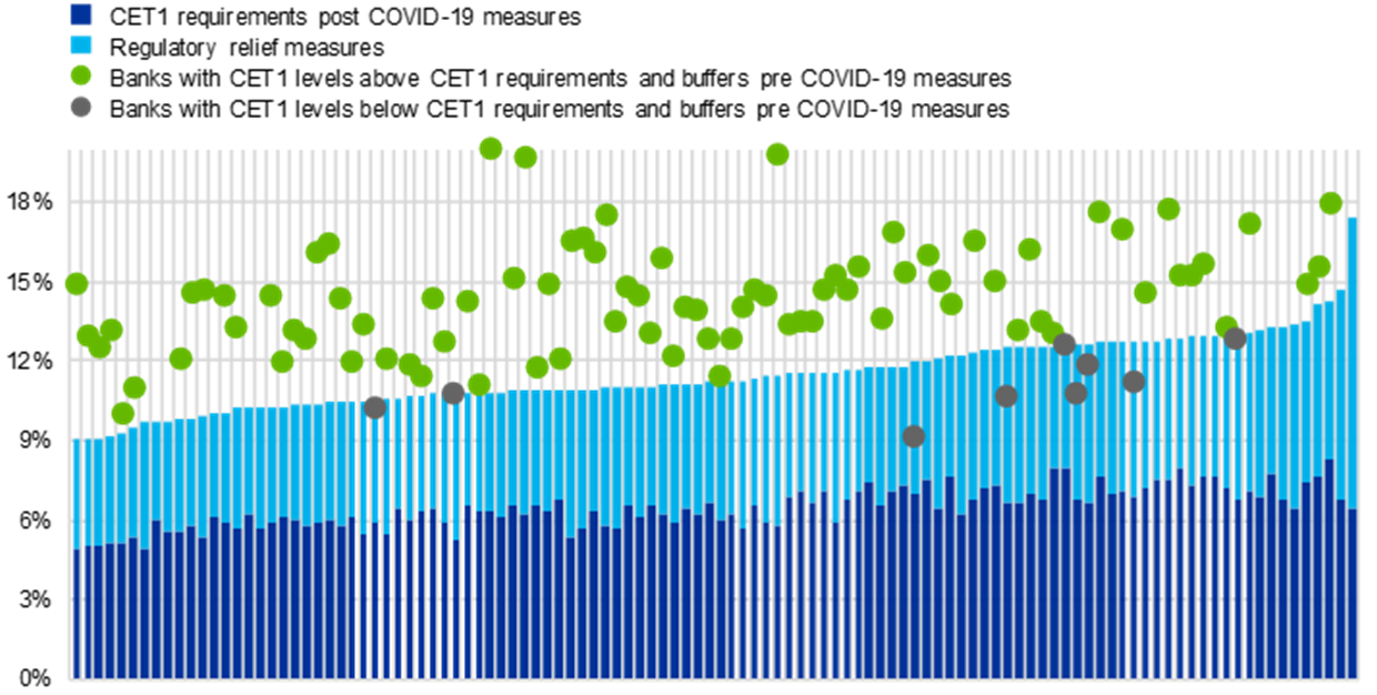 Nota: Niveles de CET1, colchones sistémicos (para EISM, para OEIS y contra riesgos sistémicos) y colchón de capital anticíclico a T3 de 2020. Niveles de CET1, tras cubrir las deficiencias posteriores a la pandemia de COVID-19 en los requerimientos de Pilar 1 y de Pilar 2 con instrumentos adicionales de nivel 1 y de nivel 2. Las medidas regulatorias de alivio son las siguientes: Recomendaciones de Pilar 2, colchón de conservación de capital, reducción de los colchones sistémicos (para EISM, OEIS y colchón contra riesgos sistémicos) y colchón de capital anticíclico puesto a disposición por las autoridades por las autoridades nacionales, composición del Pilar 2 en AT1 y T2, tras la decisión del BCE de 12 de marzo de 2020 de adelantar la aplicación de la Directiva de Requisitos de Capital V (DRC V), de acuerdo con la cual los P2R deberían tener la misma composición de capital que los de Pilar 1. Por tanto, los P2R deben satisfacerse con un 56,25 % en CET1 y un 75 % en instrumentos de nivel 1 como mínimo. La muestra incluye 112 entidades significativas