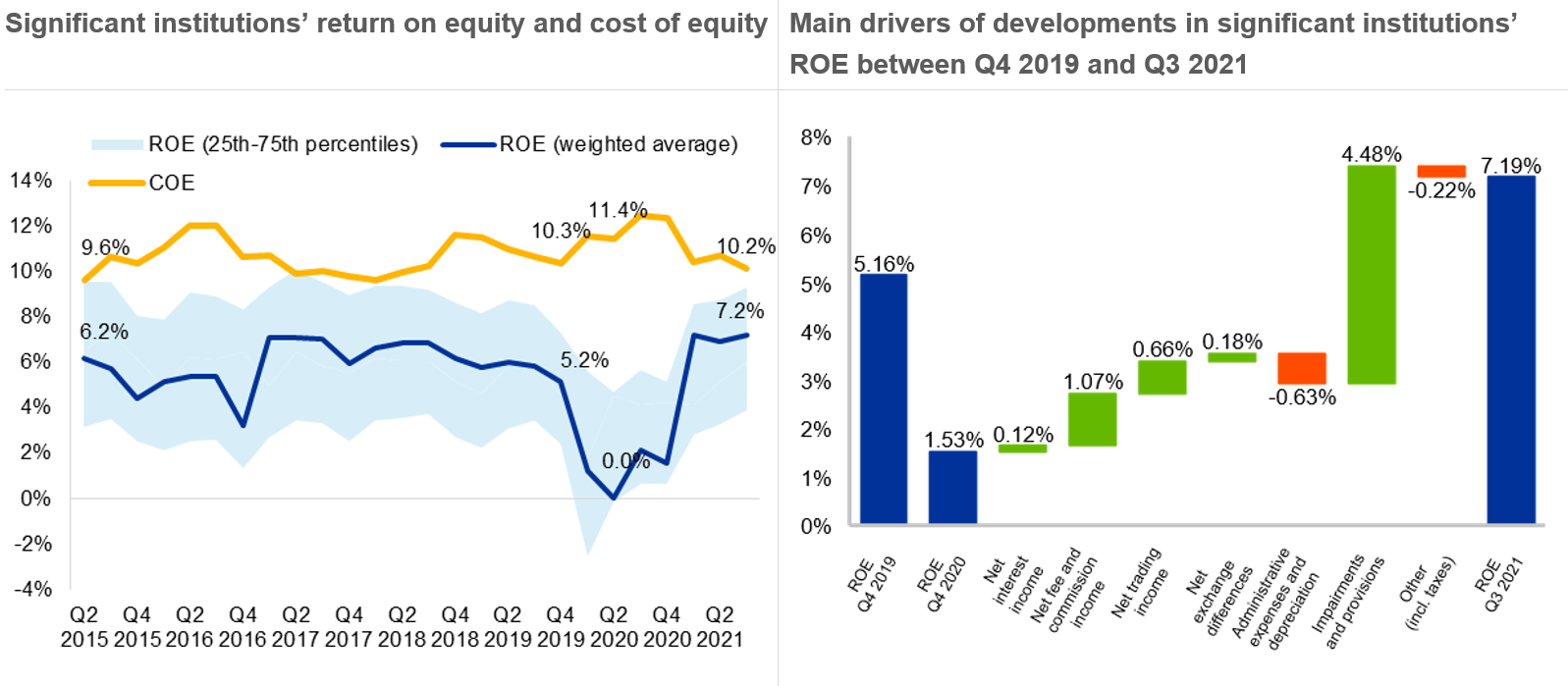 Notes left-hand chart: For return on equity (ROE), the sample comprises 113 SIs as at Q3 2021. The number of SIs can change from one reference period to another owing to amendments to the list of SIs following assessments by ECB Banking Supervision. Cost of equity (COE) is computed based on data for the 113 banks classified as SIs in Q3 2021 (constant sample) and following the methodology in the ECB publication “Measuring the cost of equity of euro area banks”. The chart plots the weighted average using the book value of equity.