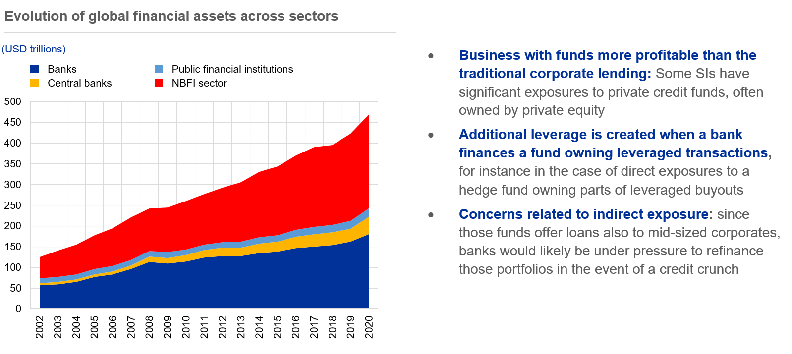 Angesichts der steigenden Verschuldung des privaten Sektors in der Pandemie, hat auch der Bankensektor sein indirektes Engagement in Finanzierungen über Nichtbanken – wie privaten Kreditfonds oder Family Offices – erhöht, um rentablere Alternativen zum traditionellen Bankgeschäft zu testen.