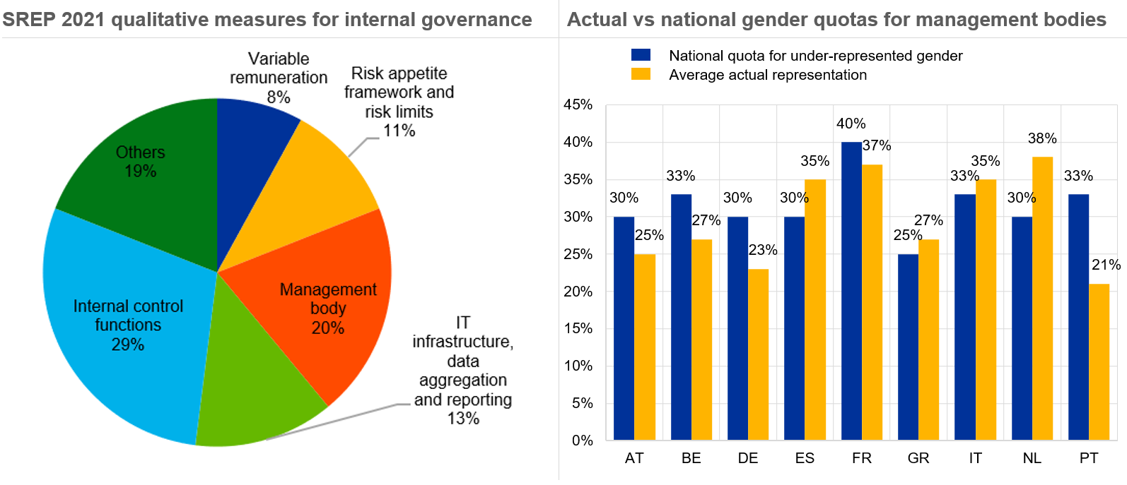 Source left-hand chart: SREP 2021 measures for internal governance (Element 2) based on 108 SREP decisions.