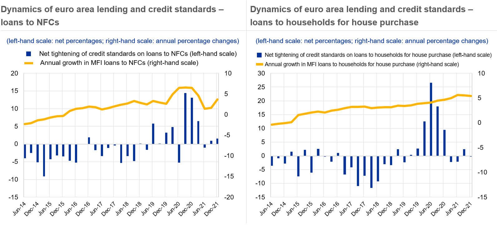 Notes: The MFI sector excludes the Eurosystem. Loans are adjusted for loan sales and securitisation; in the case of NFCs, loans are also adjusted for notional cash pooling. Net percentages are defined as the difference between the sum of the percentages of banks responding “tightened considerably” and “tightened somewhat” in the bank lending survey and the sum of the percentages of banks responding “eased somewhat” and “eased considerably”. The latest observations are for December 2021.