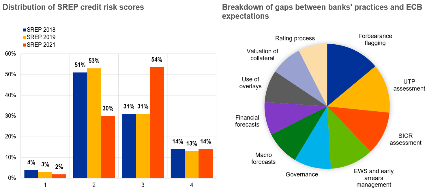 La nostra analisi dei sistemi di controllo del rischio di credito si è concentrata su ambiti quali la segnalazione delle misure di concessione, la riclassificazione dei crediti nelle diverse categorie dell’IFRS 9 e le valutazioni delle inadempienze probabili. Abbiamo individuato carenze relative al rischio di credito nel 70% delle banche da noi vigilate e vi abbiamo dato opportuno seguito adottando il 14% in più di misure qualitative sul rischio di credito rispetto all’anno precedente. Si è inoltre accentuata la gravità dei rilievi, a conferma della nostra accresciuta attività di controllo prudenziale nei confronti delle prassi di gestione del rischio di credito. Ma se le dinamiche della pandemia hanno evidenziato carenze nelle prassi relative al rischio di credito, le criticità emerse hanno tipicamente carattere strutturale. Quasi due terzi delle banche sottoposte alla nostra vigilanza hanno mantenuto invariato il loro punteggio sul rischio di credito, mentre quasi un terzo ha subito un deterioramento.