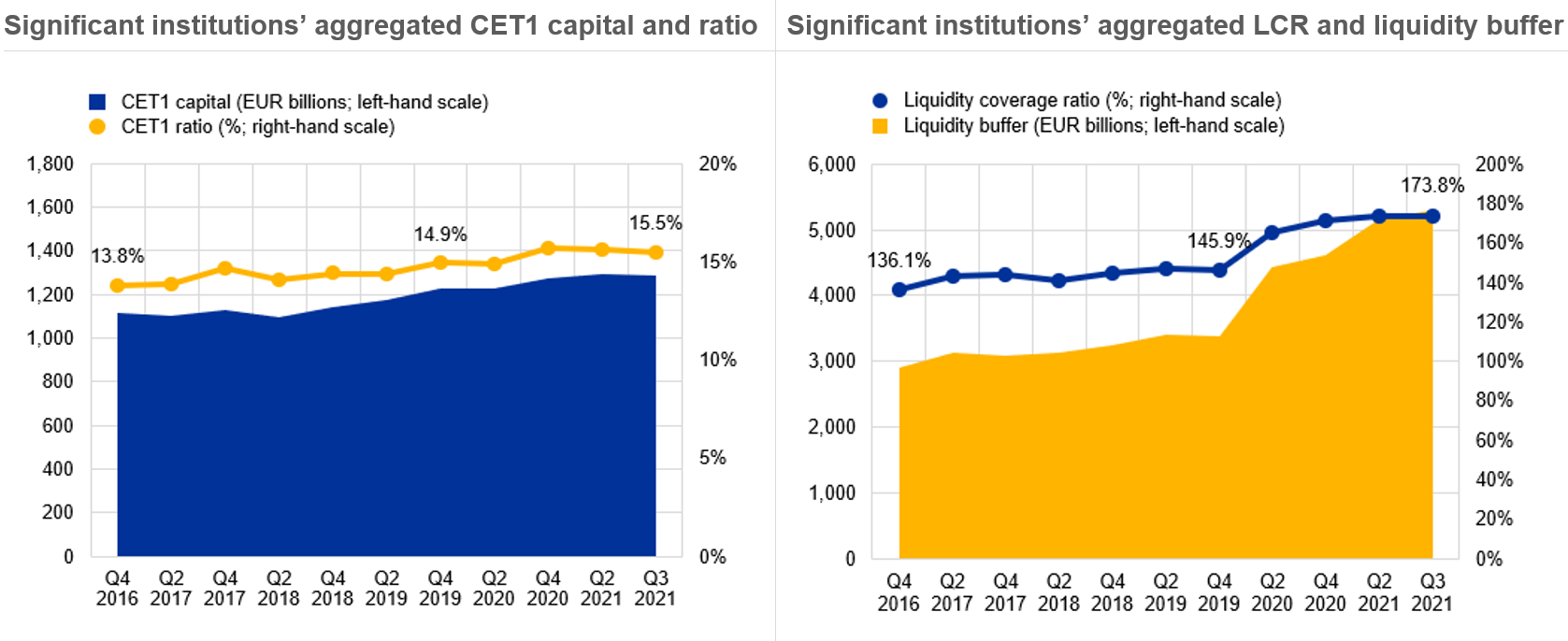 Notes right-hand chart: The sample for Q3 2021 comprises 103 SIs. The number of SIs in the sample can change from one reference period to another owing to amendments to (i) the list of SIs following assessments by ECB Banking Supervision and (ii) banks’ reporting requirements.