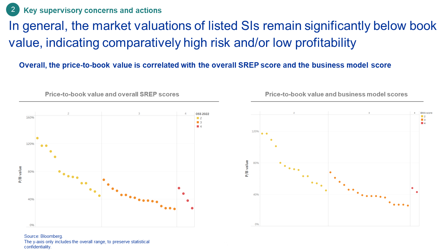 L’évaluation prudentielle, en particulier s’agissant des modèles d’activité des banques, est également reflétée sur le marché, comme le montre la corrélation évidente entre les notes SREP et les ratios cours/valeur comptable. Les valorisations boursières de la plupart des banques cotées soumises à notre supervision demeurent bien en deçà de leurs valeurs comptables malgré l’amélioration due aux résultats positifs qu’elles ont enregistrés en 2022 et les perspectives optimistes pour 2023. Pour changer la donne au niveau des notes SREP et de la perception des marchés, les banques devront agir de façon décisive afin de remédier aux faiblesses qu’elles continuent d’afficher. Il s’agit là désormais de l’une de nos priorités prudentielles et d’un domaine dans lequel nous allons intensifier nos efforts.