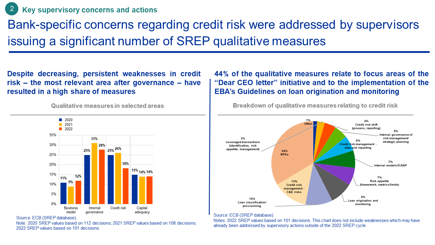 Les améliorations de la qualité des actifs ont entraîné une légère augmentation des notes SREP moyennes relatives au risque de crédit. Pour la plupart des banques soumises à la surveillance prudentielle, cette note est toutefois restée inchangée du fait des incertitudes entourant les perspectives macroéconomiques et de signes de risque de crédit latent. Les poches de risques, par exemple l’exposition au financement à effet de levier, les incertitudes concernant les perspectives macroéconomiques et géopolitiques et les déficiences persistantes dans les cadres et les pratiques de gestion des risques de crédit ont également limité toute amélioration des notes. Du fait de ces faiblesses persistantes, le risque de crédit a représenté la deuxième part la plus élevée de mesures prudentielles, après la gouvernance interne, bien que la part des banques ayant reçu des mesures qualitatives sur le risque de crédit soit passée de 26 % en 2021 à 18 % en 2022.