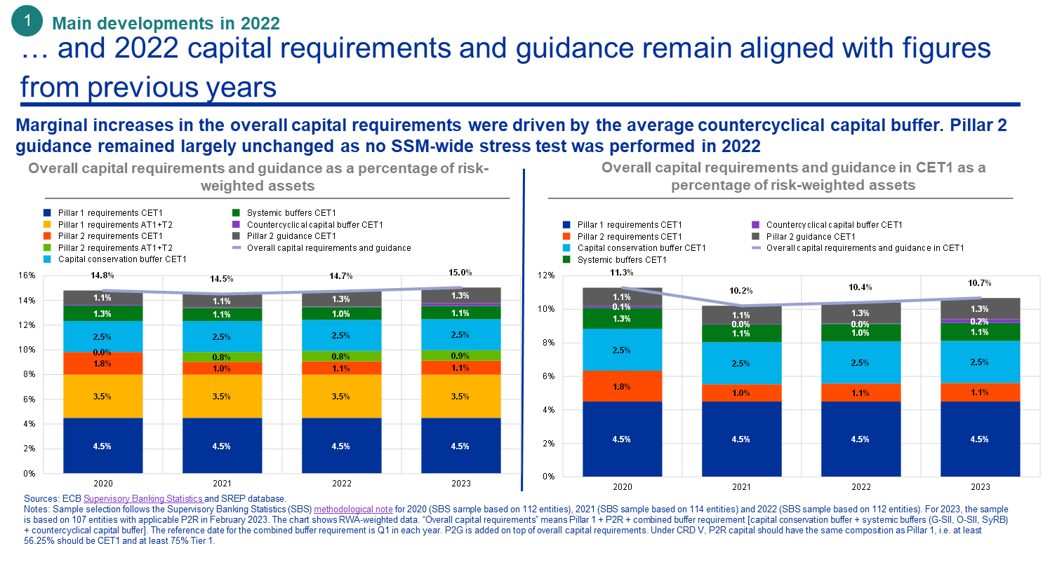 Les banques soumises à la surveillance prudentielle directe n’ayant fait l’objet d’aucun test de résistance relatif aux fonds propres en 2022, les recommandations de fonds propres au titre du pilier 2 sont restées largement inchangées, à 1,3 %, par rapport à 2021.