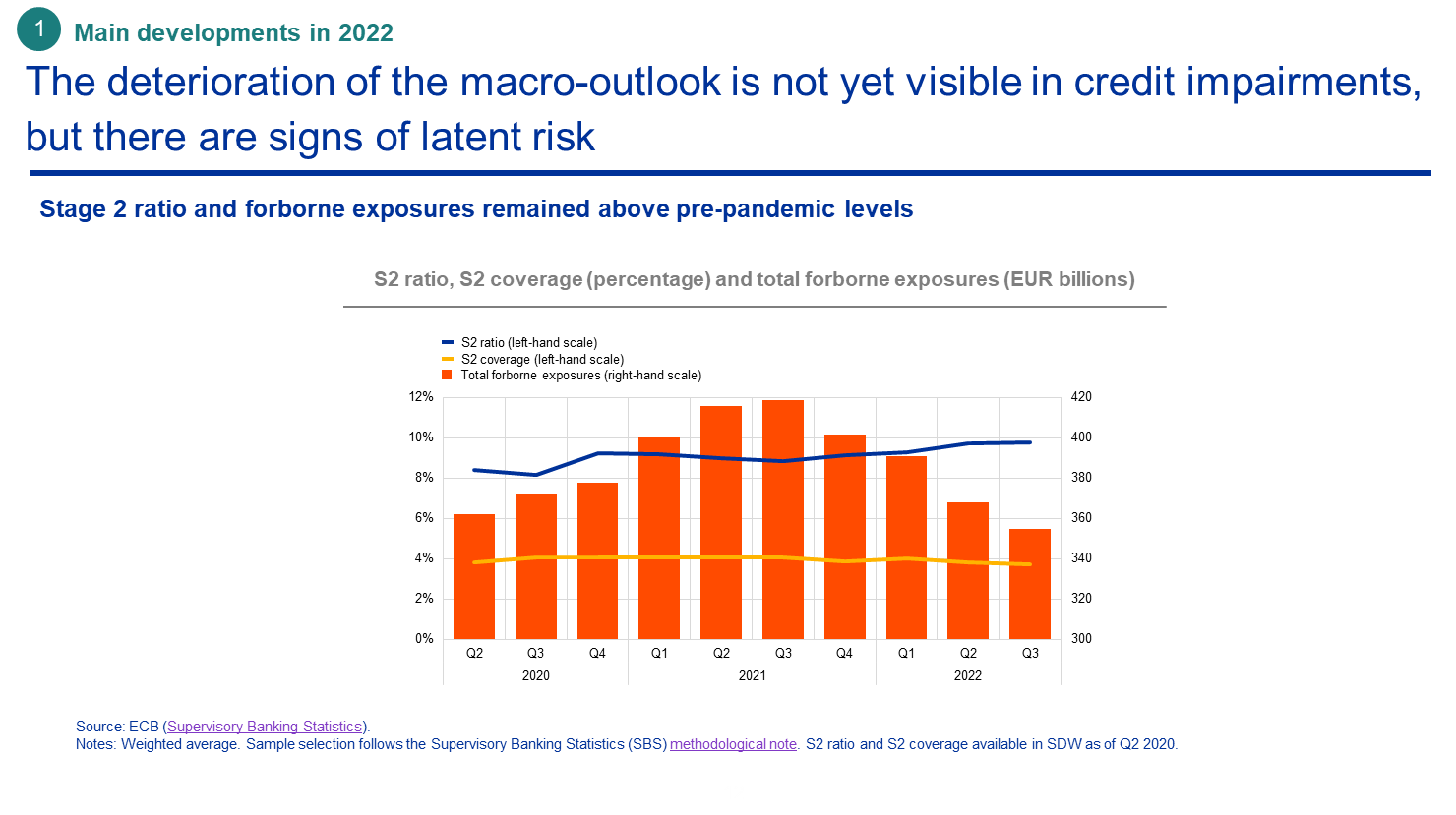 Les perspectives économiques de la zone euro se sont détériorées en 2022. Les banques font désormais face à une période de croissance ralentie et à la possibilité d’une récession, accompagnées d’une inflation forte et persistante et d’incertitudes considérables s’agissant de l’approvisionnement en énergie. Si la hausse des taux d’intérêt stimule actuellement la rentabilité des banques, elle pourrait aussi nuire à la capacité de remboursement des clients pour un grand nombre de portefeuilles et de lignes d’activité, menaçant ainsi la qualité des actifs des banques. Parmi les domaines d’action prudentielle, on peut notamment citer les prêts à la consommation, les prêts immobiliers et le financement à effet de levier.