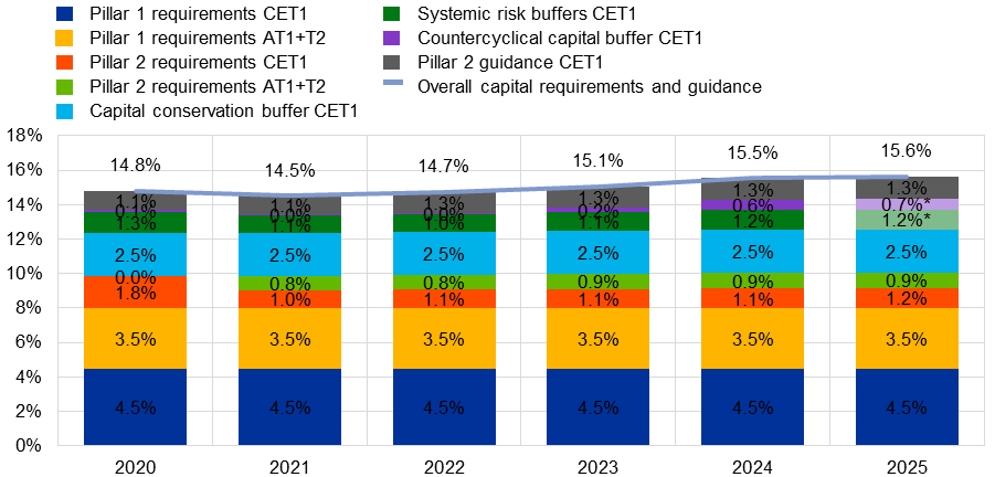 Notes : les échantillons ont été constitués suivant l’approche adoptée dans la note méthodologique des statistiques bancaires prudentielles. L’échantillon du premier trimestre 2020 est basé sur 112 entités, l’échantillon du premier trimestre 2021 est basé sur 114 entités, l’échantillon du premier trimestre 2022 est basé sur 112 entités, l’échantillon du premier trimestre 2023 est basé sur 111 entités et l’échantillon du premier trimestre 2024 est basé sur 110 entités Pour 2025, l’échantillon du premier trimestre est basé sur 109 entités avec des exigences de fonds propres au titre du pilier 2 (P2R) applicables en janvier 2025. Le graphique présente des données pondérées des RWA du deuxième trimestre 2024. Les exigences globales de fonds propres (overall capital requirements) comprennent les exigences minimales au titre du pilier 1, les exigences au titre du pilier 2, les exigences globales de coussin de fonds propres (à savoir le coussin de conservation des fonds propres et les coussins systémiques (établissements d’importance systémique mondiale, autres établissements d’importance systémique et coussins contre le risque systémique) et le coussin de fonds propres contracyclique). Des différences d’arrondis sont possibles. La date de référence correspondant à l’exigence globale de coussin de fonds propres est le premier trimestre de chaque année. Pour le premier trimestre 2025, les coussins sont estimés sur la base des taux annoncés applicables à cette date. Les estimations sont indiquées dans une couleur plus claire et suivies d’un astérisque. Les recommandations au titre du pilier 2 sont ajoutées aux exigences globales de fonds propres. En vertu de la directive sur les exigences de fonds propres (Capital Requirements Directive, CRD V), entrée en vigueur le 1er janvier 2021, les fonds propres au titre des P2R devraient avoir la même composition qu’au titre du pilier 1, c’est-à-dire qu’au moins 56,25 % devraient être des fonds propres CET1 et au moins 75 % des fonds propres de catégorie 1 (Tier 1). Par dérogation à l’article 104 bis, paragraphe 4, premier alinéa, de la CRD V, l’autorité compétente peut exiger de l’établissement qu’il remplisse ses exigences de fonds propres supplémentaires avec une proportion plus élevée de fonds propres de catégorie 1 ou de fonds propres CET1, dans le cas où c’est nécessaire et compte tenu des circonstances spécifiques à l’établissement.