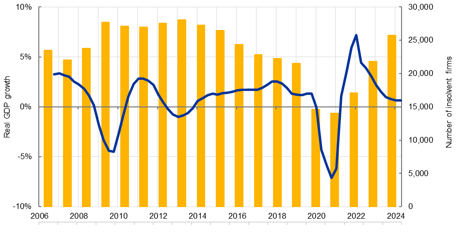Les faillites sont présentées comme le nombre moyen d’entreprises par trimestre de chaque année. Le PIB en volume équivaut au taux de croissance de la somme mobile sur quatre trimestres. La dernière observation se rapporte au deuxième trimestre 2024.
