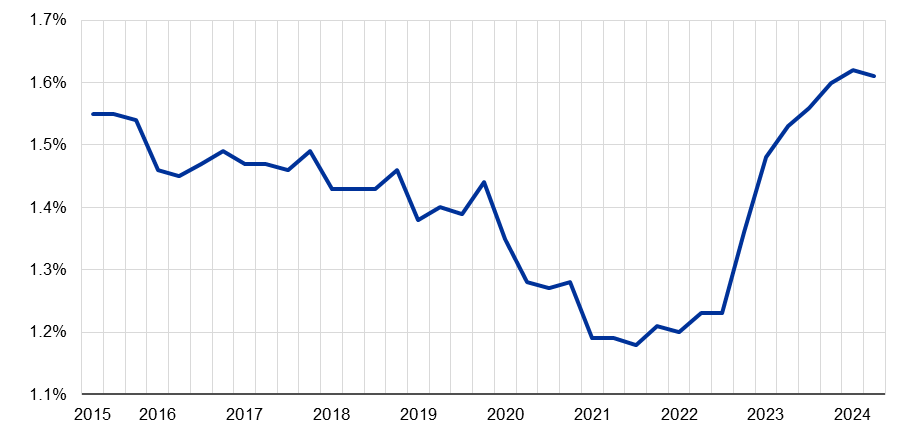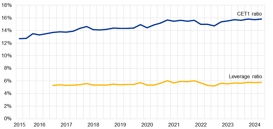 Le banche vigilate direttamente dalla BCE hanno nell’insieme solide posizioni patrimoniali e di liquidità, un miglioramento significativo rispetto a dieci anni fa[1]. Il coefficiente di capitale primario di classe 1 (Common Equity Tier 1, CET1) in termini aggregati si è collocato al 15,8% a metà del 2024, in lieve miglioramento rispetto all’anno precedente. Allo stesso modo, il coefficiente di leva finanziaria è aumentato leggermente al 5,8%.