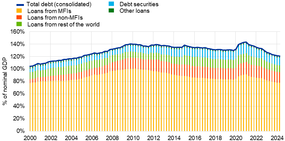 Note: la sigla MFI (monetary financial institution) indica le istituzioni finanziarie monetarie. Il debito lordo consolidato è definito come il debito lordo totale meno i prestiti concessi da imprese e famiglie. Le ultime osservazioni si riferiscono al secondo trimestre del 2024.