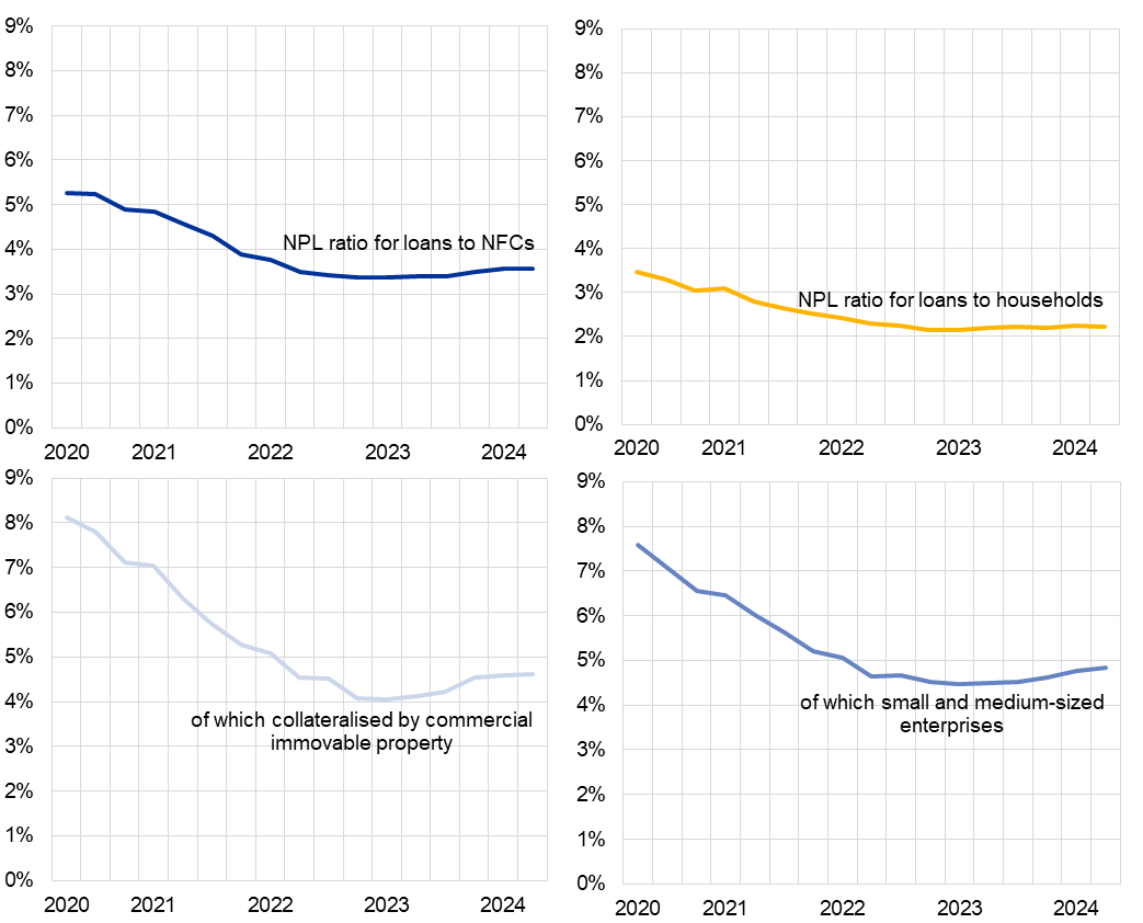 I bassi livelli del rischio di credito riflettono i solidi fondamentali delle famiglie e delle imprese, ma sono in parte riconducibili anche al sostegno pubblico fornito durante la pandemia di COVID-19 e le crisi energetiche. Nel complesso, la sostenibilità del debito delle famiglie beneficia del vigore del mercato del lavoro, dell’aumento dei salari e della diminuzione dei livelli di indebitamento. I bilanci e la redditività delle imprese hanno continuato a mostrare, in generale, una buona tenuta nel 2024, grazie anche al calo dei costi degli input e dell’energia.