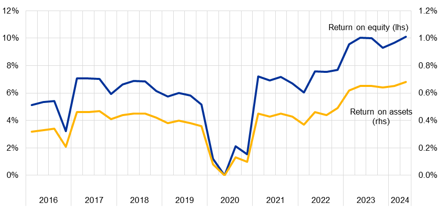La redditività delle banche è rimasta elevata, con un rendimento annualizzato del capitale del 10,1% a metà del 2024. Una determinante fondamentale è rappresentata dai più alti tassi di interesse: durante il periodo di tassi contenuti il rendimento medio del capitale delle banche era pari al 5,5%; a seguito della normalizzazione dei tassi è aumentato al 9,2%[3]. Inoltre, il rapporto costi/ricavi è sceso in media dal 66% nel 2020 al 54% nel 2024. Il costo del rischio è rimasto contenuto.