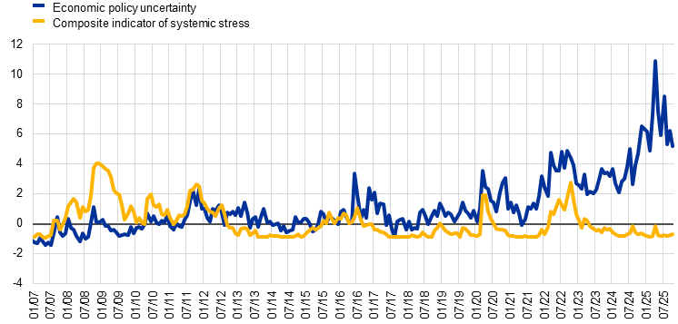 Notes: The composite indicator of systemic stress and the economic policy uncertainty index are monthly data series (standardised by the standard deviation from the mean over the period January 1999-December 2019). A value of 2 should be taken to mean that the uncertainty measure exceeds its historical average level by two standard deviations. The latest observations are for August 2025.