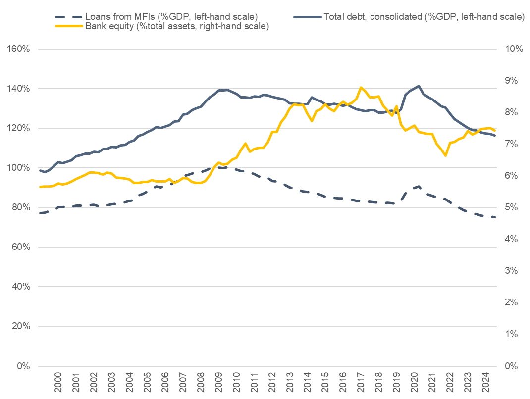 Notes: MFI stands for "monetary financial institutions”. Consolidated gross debt is defined as total gross debt minus loans granted by firms and households. The latest observations are for the second quarter of 2024.