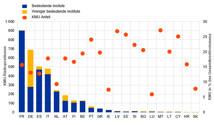 Aufschlüsselung der KMU-Risikopositionen nach bedeutenden Instituten (SIs) und weniger bedeutenden Instituten (LSIs) sowie des KMU-Anteils am Gesamtkreditvolumen nach Land des Kreditgebers oder der Bankengruppe