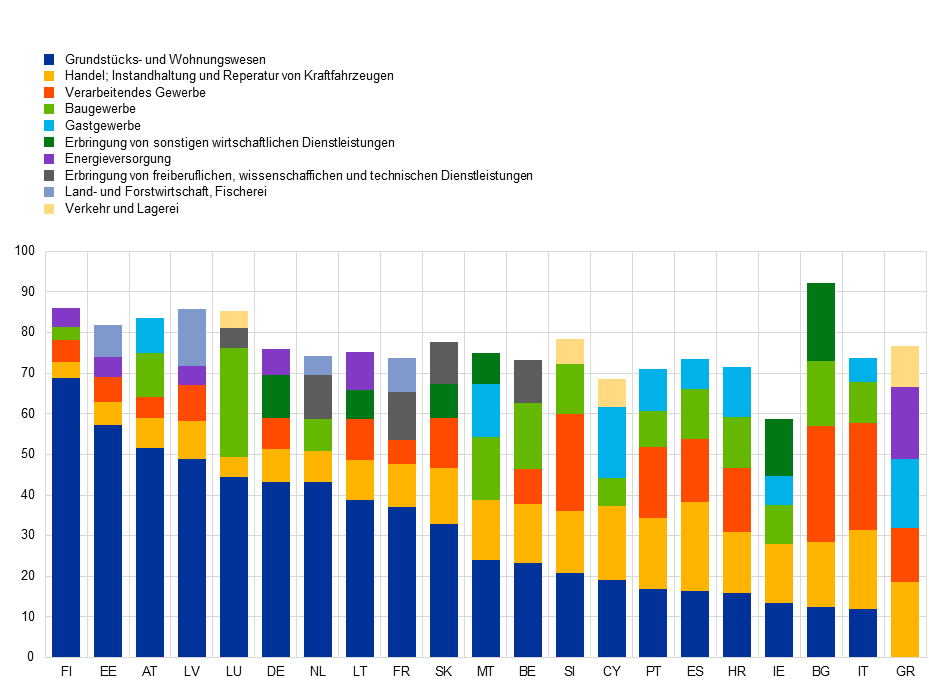 Abbildung 2 zeigt, dass in den Kreditportfolios der Banken hohe sektorale Konzentrationen bestehen. Diese Konzentrationen werden von der EZB im Falle einer sich abzeichnenden sektoralen Krise oder bei Vorliegen einer Krise bei einem oder mehreren großen Unternehmen überwacht. Die Risikopositionen gegenüber dem Immobiliensektor sind, im Gegensatz zu den anderen Sektoren, für fast alle Länder wesentlich. Der Immobiliensektor war in den letzten Jahren aus verschiedenen Gründen mit Herausforderungen konfrontiert, wobei der Sektor der Büroimmobilien davon am stärksten betroffen war. Allerdings waren die Probleme weitgehend auf Deutschland, Österreich und Luxemburg beschränkt.