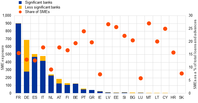 The breakdown of SME exposure for significant banks and less-significant banks and the share of SME exposure from total loans and advances, by country of lender or banking group