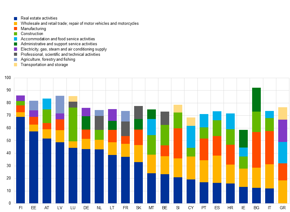 Banks’ lending portfolios show a high degree of sectoral concentration (Chart 2). This concentration will be monitored by the ECB in the event of an emerging sectoral or large firm crisis. Unlike other sectors, exposures to the real estate sector are material for almost all countries. Real estate has faced challenges in recent years for a variety of reasons, with the office sector being the most negatively affected. However, the issues have largely been contained to Germany, Austria and Luxembourg.